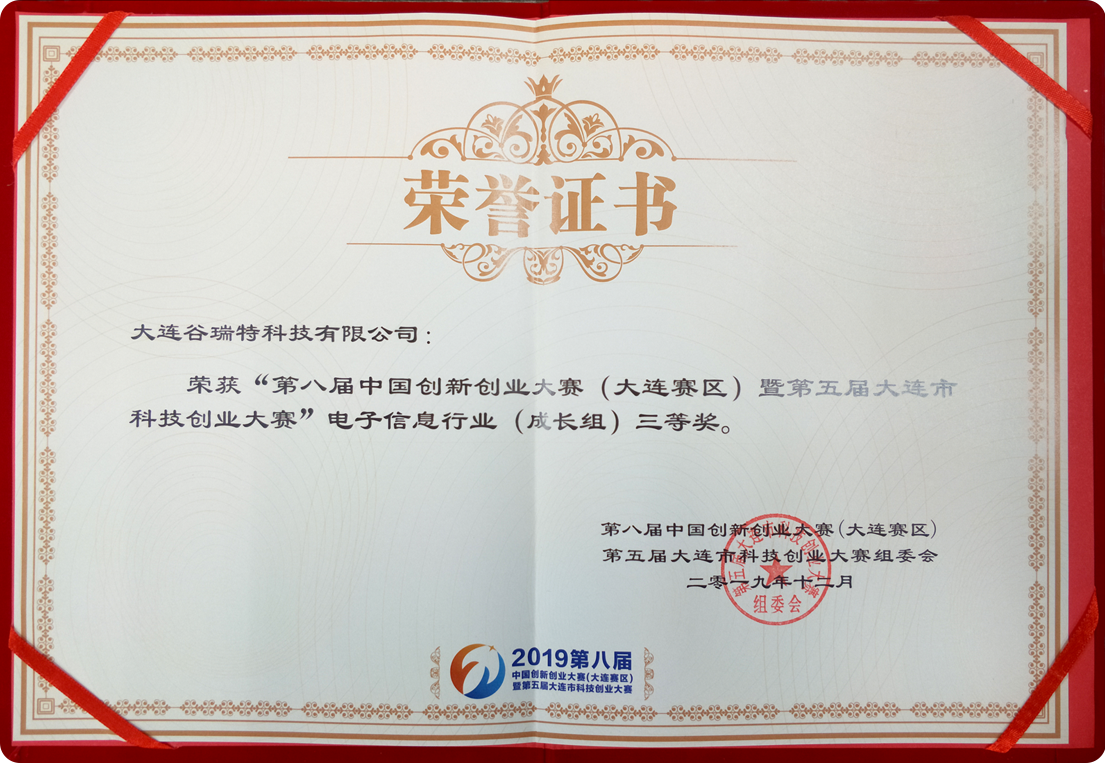 歷經(jīng)嚴(yán)格的資格審查、初賽、復(fù)賽、決賽,以及一系列精彩路演和激烈角逐,最終我司從634家企業(yè)中脫穎而出,榮獲“2019第八屆中國創(chuàng)新創(chuàng)業(yè)大賽(大連賽區(qū))暨第五屆大連科技創(chuàng)業(yè)大賽”電子信息行業(yè)(成長組)三等獎。