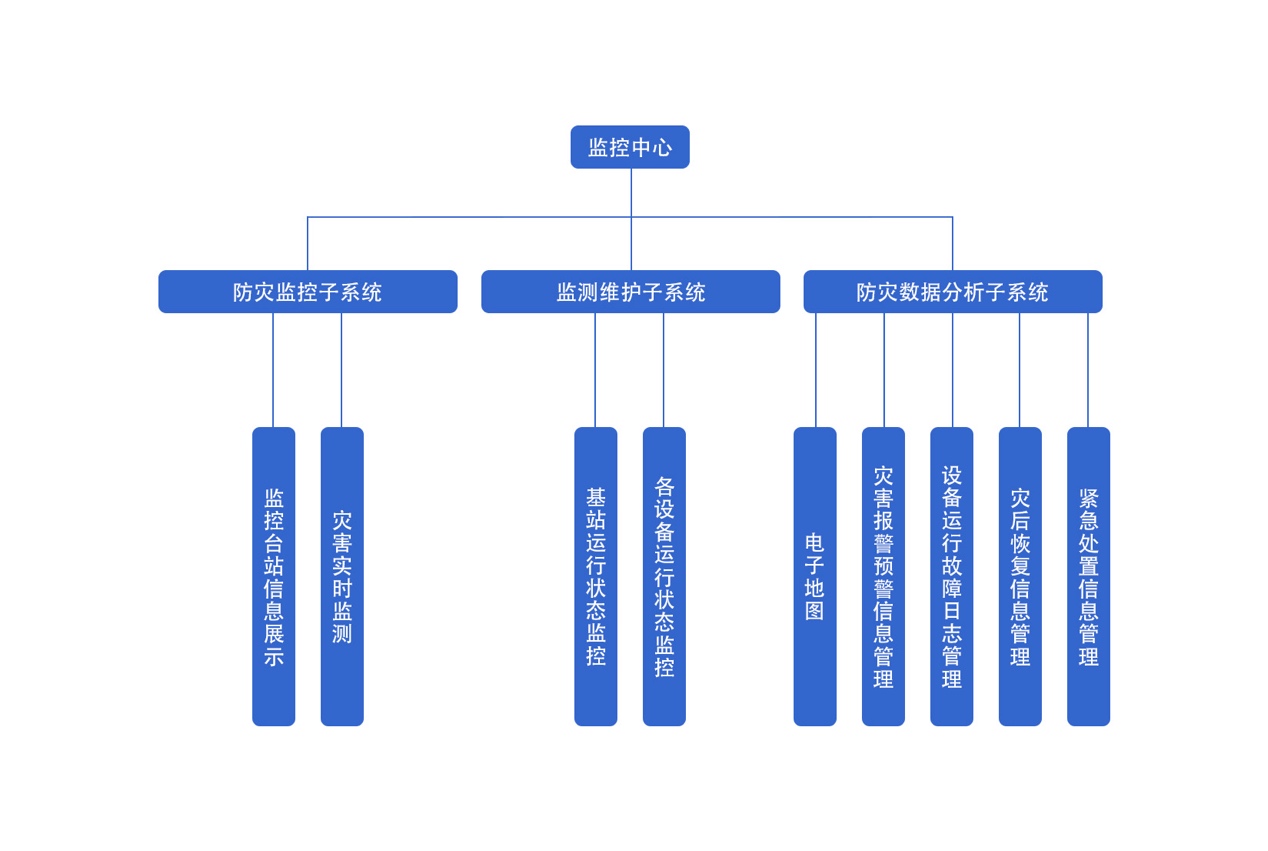 監(jiān)控中心能夠對防災監(jiān)測區(qū)域內進行全方位的災害監(jiān)測及預警,對各個監(jiān)測設備進行全方位、多層次的監(jiān)控和管理。對監(jiān)控設備運行狀態(tài)實時監(jiān)測,同時對接收到的報警、預警信息進行展示,實現(xiàn)電子地圖自動定位、多點災害預測定位,自動化災害緊急處置、設備故障日志查詢、災害報警預警數(shù)據(jù)查詢導出、實時監(jiān)測等功能。